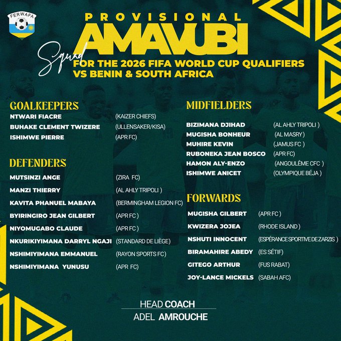 Mu ijoro ryo ku wa Gatatu, tariki ya 1 Ukwakira 2025, nibwo Umutoza w’Ikipe y’Igihugu Amavubi, Adel Amrouche afatanyije n’abarimo umutoza wungirije Eric Nshimiyimana n’abantu b’imbere muri FERWAFA bashyize hanze urutonde rw’abakinnyi 23 bazifashishwa mu mikino ibiri ikomeye yo gushaka itike y’Igikombe cy’Isi cya 2026 kizabera muri Amerika, Canada na Mexico.