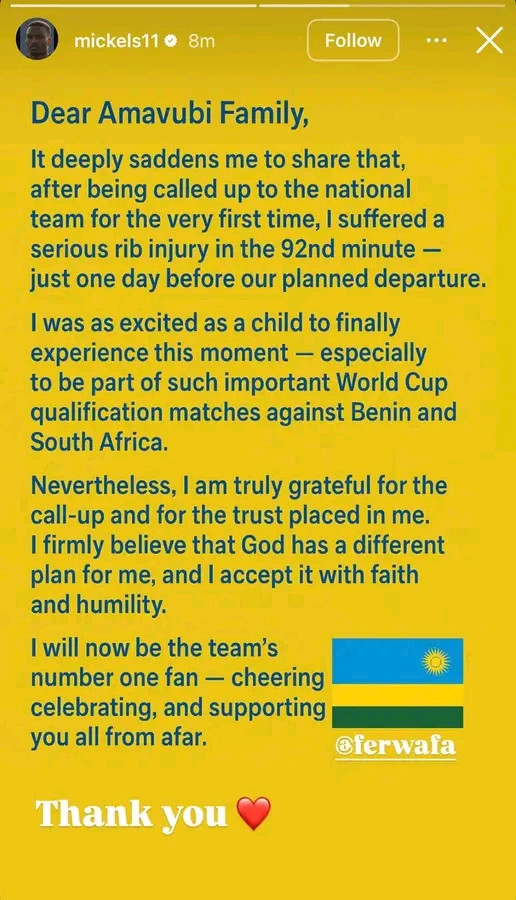 Mickels wari warahamagawe ku nshuro ye ya mbere mu ikipe y’igihugu yashimangiye iby’aya makuru abicishije ku rukuta rwe rwa Instagram ;aho yavuze ko bitewe n’imvune ikomeye yagize ku rubavu rwe ku munota wa 92′ mu mukino wahuje Sabah FK na FK Karvan Evlakh, wabaye ku Cyumweru, tariki ya 5 Ukwakira 2025, byatumye adashobora kwitabira umwiherero w’ikipe y’igihugu Amavubi .
