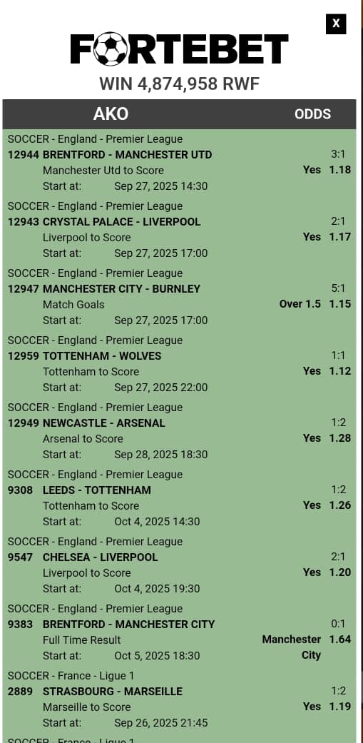 Itike ye yari ifite nimero 3526600122889999, ikubiyemo imikino myinshi ariko yatoranyije ibikubo bifite amahirwe y’intsinzi, aho umukino wa Manchester City na Brentford warufite igikubo kinini cya 1.64, ari nawo watanze icyizere cya nyuma.