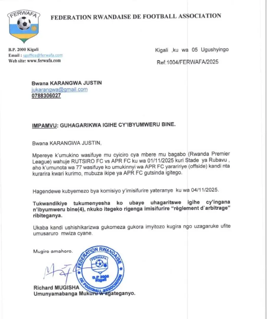 Nyuma y’umukino waranzwe n’impaka ndende hagati ya APR FC na Rutsiro FC, Ishyirahamwe ry’Umupira w’Amaguru mu Rwanda (FERWAFA) ryafashe icyemezo cyo guhagarika umusifuzi wo ku ruhande, Karangwa Justin, ibyumweru bine adasifura, nyuma yo kwanga kwemeza igitego cya APR FC cyavugishije benshi.