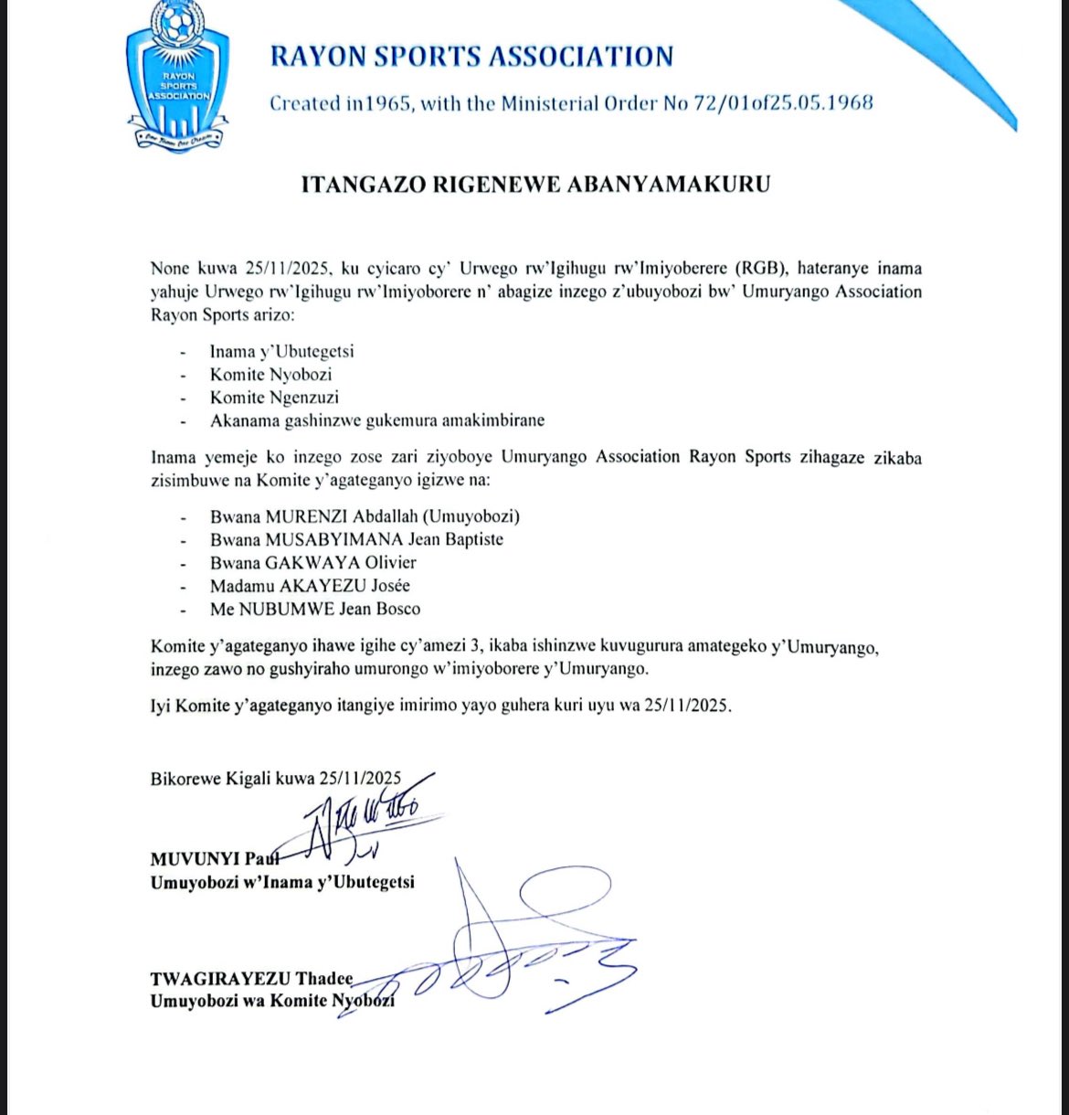 Mu ijoro ryo ku wa Kabiri, tariki ya 25/11/2025, ikipe ya Rayon Sports yatangaje ko komite yari isanzwe iyiyobora yasheshejwe, hashyirwaho Komite y’agateganyo izamara amezi atatu iyoboye Umuryango wa Rayon Sports, inahabwa inshingano zo kuvugurura amategeko n’imitegekere yose y’uyu muryango.