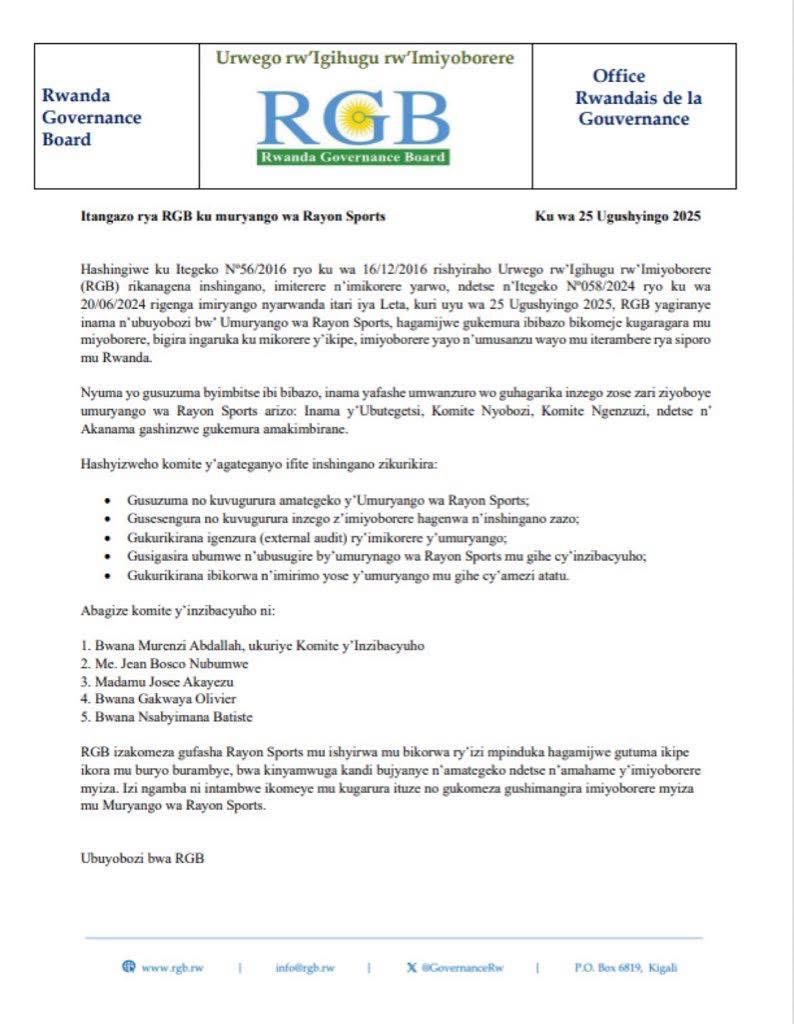 Ibi byatangajwe mu itangazo ryashyizwe ahagaragara nyuma y’inama yabereye ku cyicaro cy’Urwego rw’Igihugu rw’Imiyoborere (RGB), aho hateraniye abayobozi ba RGB hamwe n’inzego zitandukanye z’ubuyobozi bwa Rayon Sports zirimo Inama y’Ubutegetsi, Komite Nyobozi, Komite Ngenzuzi n’Akanama gashinzwe gukemura amakimbirane.