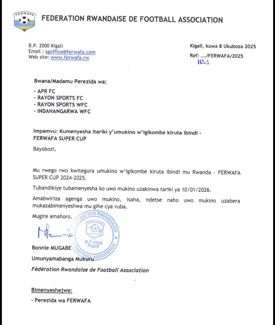 Amatariki ya Ferwafa Super Cup yamenyekanye